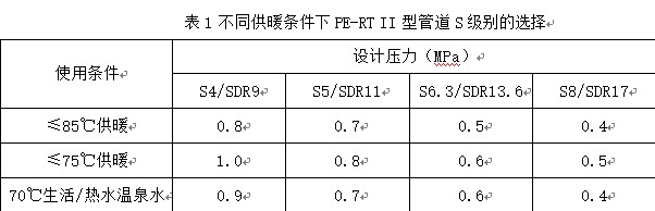 在中國(guó),采暖方式的選擇是根據(jù)建筑類型和所在地區(qū)的氣象條件、能源狀況以及技術(shù)經(jīng)濟(jì)等情況的比較來(lái)確定的。通常,一年中累計(jì)90天以上日平均溫度低于5℃的地區(qū),宜采用集中供暖;實(shí)際應(yīng)用中,二次管網(wǎng)的熱水經(jīng)過(guò)換熱站之后通常溫度都不太高。如果戶內(nèi)采用散熱器采暖,供回水溫度約為60-80℃,運(yùn)行壓力基本在0.8MPa以下,根據(jù)《Ⅱ型耐熱聚乙烯(PE-RTⅡ)低溫直埋供熱管道設(shè)計(jì)與施工規(guī)范》DB37/T 5021-2014 的規(guī)定,按照50年的設(shè)計(jì)要求,在不同的供暖條件下PE-RT II型管道的承壓能力及S級(jí)別選擇見(jiàn)表1