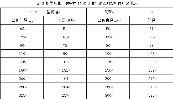 與鋼管比較,PE-RT II型管道的摩擦阻力小,同樣內(nèi)徑的管材流量是鋼管的1.25倍,隨著鋼管的腐蝕,內(nèi)壁會(huì)變得更加粗糙,流量也會(huì)逐年降低,相同流量的情況下,PE-RT II型管道與鋼管的規(guī)格選型見(jiàn)表2