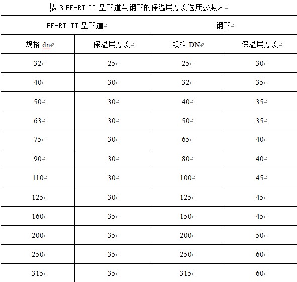 PE-RT II型供熱管道與鋼管相同,都采用工作管、保溫層、外護(hù)管三位一體的保溫結(jié)構(gòu),由于PE-RT II型材料的導(dǎo)熱系數(shù)為鋼管的1%,即管材本身具有較好的保溫性能,且PE-RT II型管道、保溫層、外護(hù)管的熱膨脹系數(shù)基本一致,會(huì)成為一個(gè)整體,不易分層、脫落,管道保溫效果優(yōu)于鋼管,在相同的外界溫度條件下,更節(jié)約保溫材料。以輸送80℃熱水為例,相同流量的外界溫度下,PE-RT II型管道與鋼管的保溫層厚度選型見(jiàn)表3