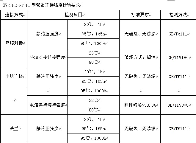 PE-RT II型管材、管件參照GB/T28799-2012執(zhí)行,管道連接強(qiáng)度要求詳見(jiàn)表4
